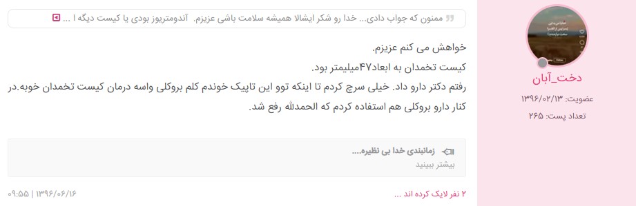 نظر کاربر (banooe2m) در نی نی سایت درباره درمان کیست