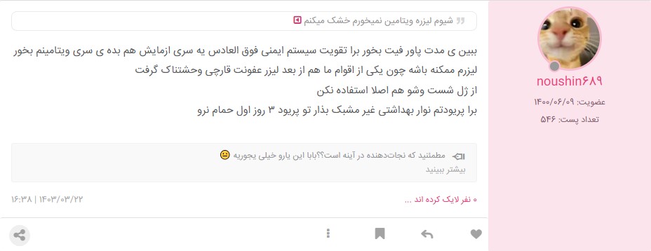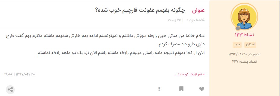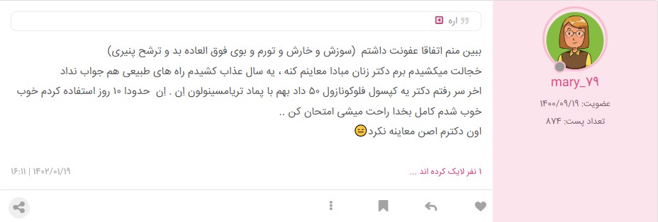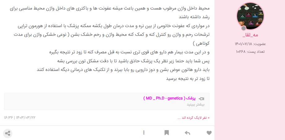 یکی از کاربران نوشته است: « پماد کلوتریمازول و شیاف کلوژین … خوب میشه و کلی رعایت میکنم مشکل هورمونی ندارم »