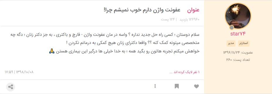 عفونت واژن یکی از مشکلات شایعی است که بسیاری از خانم ها در طول زندگی خود با آن مواجه می شوند . در انجمن های پرطرفداری مثل نی نی سایت ، کاربران تجربیات شخصی خود را درباره علائم ، راه های درمان خانگی و مراجعه به پزشک به اشتراک گذاشته اند .